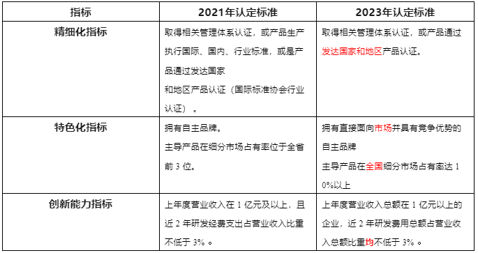 在特色化指標方面,對產(chǎn)品品牌的市場競爭優(yōu)勢有了更高的標準。2021年認定標準是“擁有自主品牌”、“主導產(chǎn)品在細分市場占有率位于全省前3位”。2023年的認定標準,對產(chǎn)品品牌更加強調(diào)“擁有直接面向市場并具有競爭優(yōu)勢的自主品牌”,對細分市場占有率的要求需要達到全國10%以上。