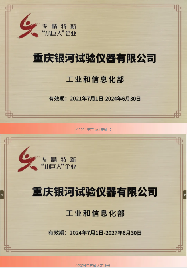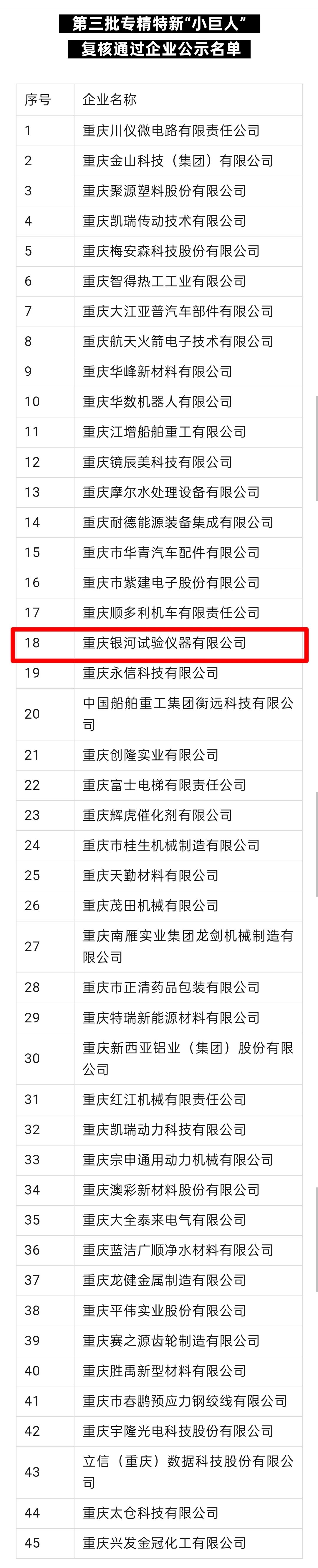 2024年9月2日,重慶市經(jīng)濟(jì)和信息化委員會公示了通過審核的企業(yè)名單,重慶銀河試驗儀器有限公司在第三批專精特新“小巨人“復(fù)核通過企業(yè)公示名單中。