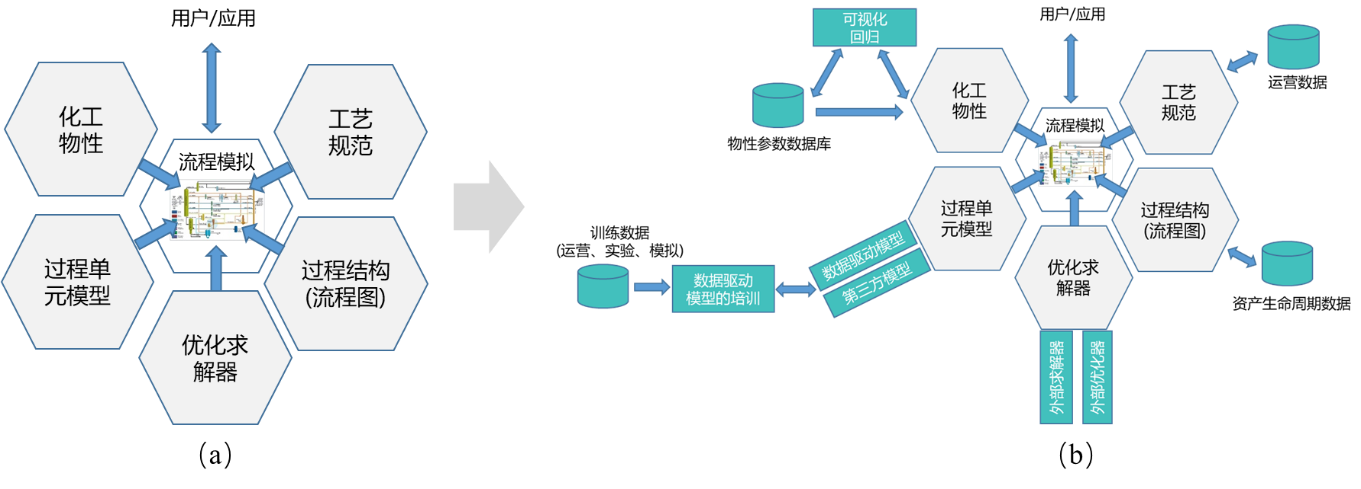 化工流程模擬軟件同樣向平臺化發展?;ち鞒棠M軟件應用于工藝設計、虛擬開車、操作員培訓、生產優化等工廠全生命周期。經過40多年發展,領先供應商的產品已經集成穩 態模擬與動態模擬、集成煉油模擬與化工模擬,主要包括5大功能模塊,即工藝規范、過程結構(流程圖) 、優化求解器、過程單元模型和化工物性,如圖2(a所示,并通過CAPE- OPEN軟件接口標準促進了通用流程模擬軟件平臺與單元模型、熱力學模型組件間的互操作。未來,化工流程模擬平臺軟件的5大模塊將進一步融合生產實時數據、實驗數據、資產生命周期數據,進一步集成第三方求解器、優化器、大數據模型、專用反應器模型、物性數據庫等,為打造石化工藝數字孿生提供平臺化支撐,如圖 2(b)所示。