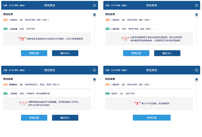 系統(tǒng)根據(jù)危化品理化性質(zhì),提示配伍禁忌,避免不相容的危化品混放混存,極大降低安全風(fēng)險(xiǎn)。