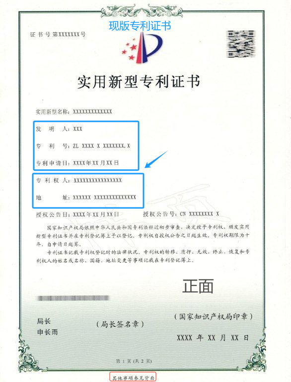 (新版實用新型專利證書和現版實用新型專利證書)