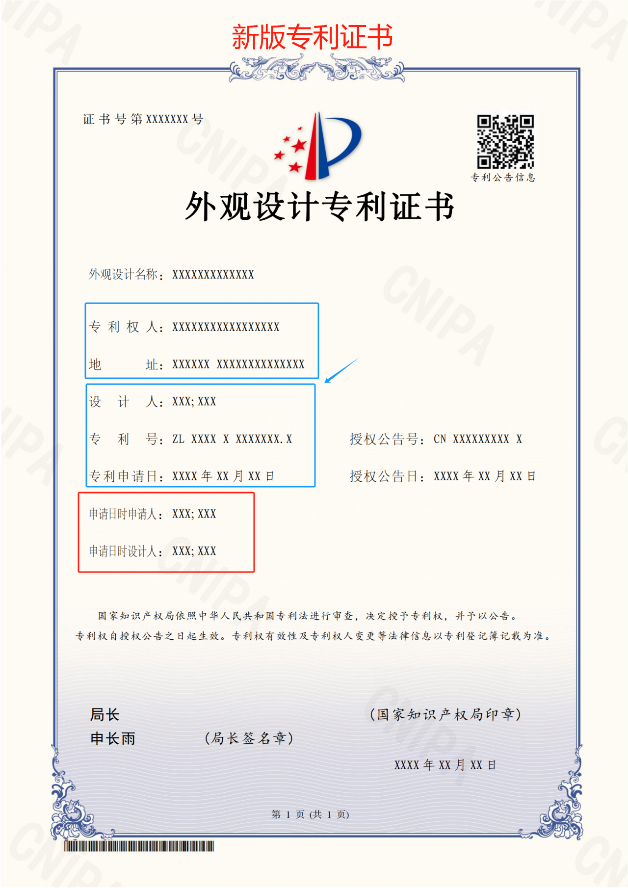 此外,實用新型專利證書和外觀設計專利證書也有相同變化。