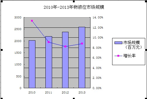 現(xiàn)如今,中國(guó)物液位儀表市場(chǎng)發(fā)展已經(jīng)漸趨平穩(wěn),除 2009 年受金融危機(jī)影響市場(chǎng)需求下降外,近幾年一直保持著 10%左右的速度持續(xù)發(fā)展。盡管在宏觀經(jīng)濟(jì)緊縮政策調(diào)控的情況下,2011 年仍然延續(xù)了 2010 年物液位儀表市場(chǎng) 13.3%的回轉(zhuǎn)增速勢(shì)頭,整體業(yè)績(jī)?nèi)〉昧?9%左右的增長(zhǎng)。展望未來(lái),隨著國(guó)際國(guó)內(nèi)經(jīng)濟(jì)形勢(shì)漸趨明朗,物液位儀表市場(chǎng)將延續(xù)樂(lè)觀發(fā)展態(tài)勢(shì),預(yù)計(jì) 2012-2015 年增長(zhǎng)速度將保持在 8%以上。