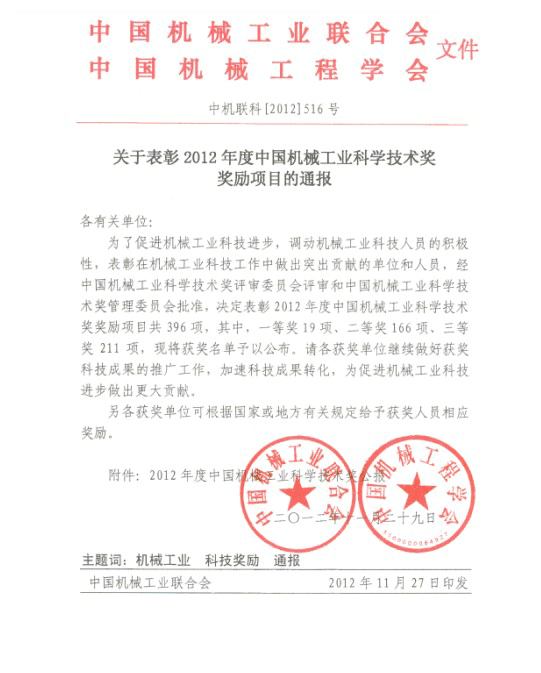 關于表彰2012年度中國機械工業科學技術獎獎勵項目
