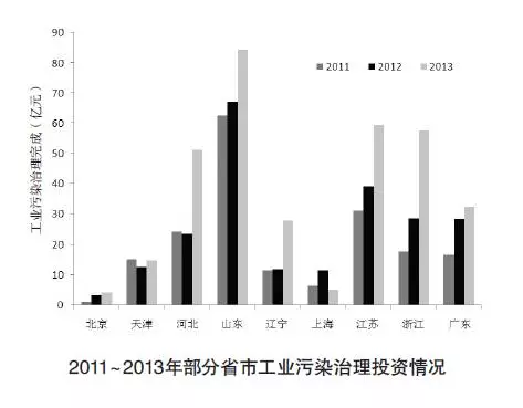 從2011~2013年北京、天津、山東和河北省等地區對工業環境污染治理投資的變化來看,各地區均呈現波次遞進性增長,其中河北省、山東省、江蘇省和浙江省的工業污染治理投資力度較大,環保投資的逐年增加,將對各區域的污染治理設施運行費用、環保產業、GDP增長、就業等方面具有較顯著的拉動作用,2011~2013年北京、河北、山東等地的工業污染治理投資情況詳見下圖[3]。