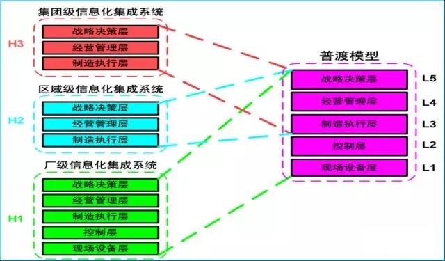 (2)H2公司級系統:此級系統應對分布的廠級系統進行系統集成、構建企業公司級的信息化集成系統。系統包括L3、L4、L5三層,但其結構與功能不同于H1的相應三層。通過縱向集成技術實現H2與H1的無縫接口,實現本級信息的貫通。