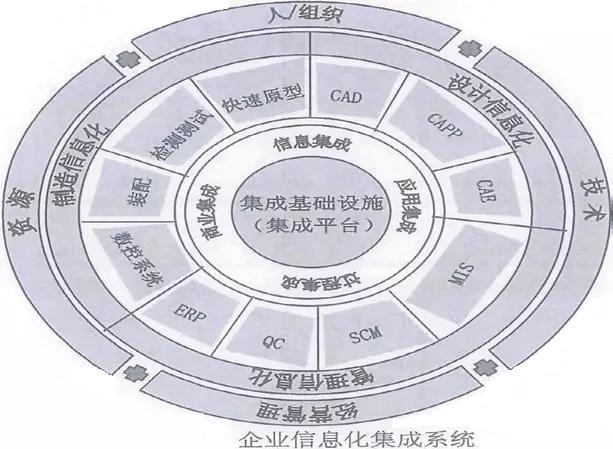 信息化集成系統分為兩大部分:控制系統(或稱控制制造系統)與企業系統(或稱企業信息化系統)。信息化集成系統則是這兩大部分的綜合與集成。