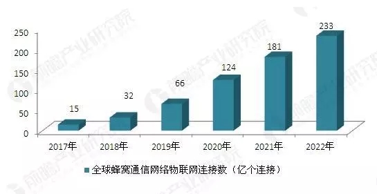 2017-2022年全球蜂窩通信網(wǎng)絡(luò)物聯(lián)網(wǎng)連接數(shù)預(yù)測(cè)(單位:億個(gè)連接)