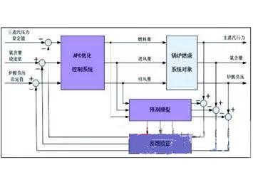 鍋爐的燃燒過程是一個(gè)極其復(fù)雜的化學(xué)過程與物理傳熱過程,鍋爐的燃料量、送風(fēng)量、引風(fēng)量的控制具有強(qiáng)耦合、非線性、多變性、大滯后等特點(diǎn),所以整個(gè)燃燒系統(tǒng)的控制必須協(xié)調(diào)控制才能保證鍋爐負(fù)荷、壓力、氧量、溫度、負(fù)壓的穩(wěn)定。針對(duì)鍋爐燃燒系統(tǒng)的這種特殊性,APC優(yōu)化控制系統(tǒng)的研發(fā)集成了多變量自適應(yīng)控制器、智能仿人工控制策略、預(yù)測控制、模糊控制、自動(dòng)尋優(yōu)、反饋校正等核心技術(shù),真正實(shí)現(xiàn)了鍋爐在正常工況與異常工況下的全自動(dòng)運(yùn)行。優(yōu)化控制系統(tǒng)輸入輸出原理圖如圖1所示。