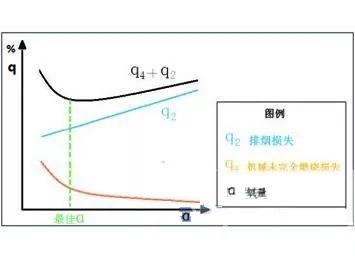 鍋爐的燃燒效率與鍋爐的氧含量有直接的關(guān)系,在散熱損失與灰渣顯熱損失相對(duì)不變的情況下,如果氧量過低,排煙損失q2雖然較低,但是機(jī)械未完全燃燒損失q4卻很高,總體效率還是較低。如果氧量過高,排煙損失q2明顯增高,即使機(jī)械未完全燃燒損失q4較低,但是總體效率依然較低,具體氧含量與鍋爐效率損失可用圖4所示的曲線表達(dá)。