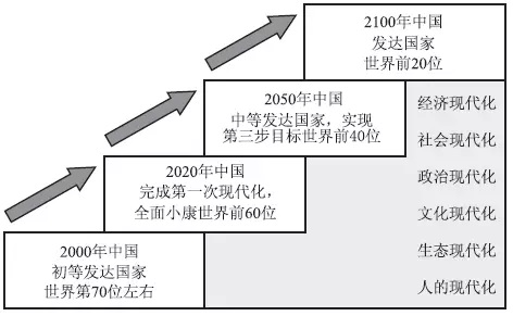 中國復興是中國衰落后再次成為一個發(fā)達國家。要成為發(fā)到國家,需要延伸我們的戰(zhàn)略目標和時間,從中等發(fā)達水平延伸到發(fā)達水平,從21世紀中葉延伸到21世紀末;戰(zhàn)略布局從“三步走”延伸到“三個臺階”,實現(xiàn)真正復興(圖7)。