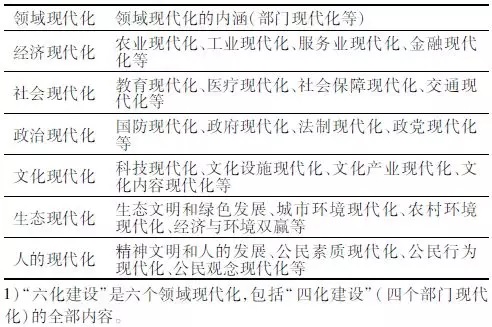 中國復興的建設內容,從“四化建設”擴展到“六化建設”,有可能實現(xiàn)全面復興。因為,從“部門現(xiàn)代化”到“領域現(xiàn)代化”(表2),內涵更豐富,內容更全面,而且可以減少“部門因素”的不利影響。例如,經(jīng)濟現(xiàn)代化包括農(nóng)業(yè)現(xiàn)代化、工業(yè)和服務業(yè)現(xiàn)代化等,社會現(xiàn)代化包括教育現(xiàn)代化、醫(yī)療和交通現(xiàn)代化等,政治現(xiàn)代化包括國防現(xiàn)代化、政府和法制現(xiàn)代化等,文化現(xiàn)代化包括科技現(xiàn)代化、文化產(chǎn)業(yè)和文化內容現(xiàn)代化等。