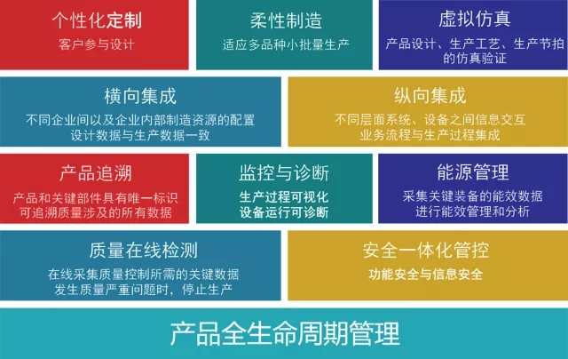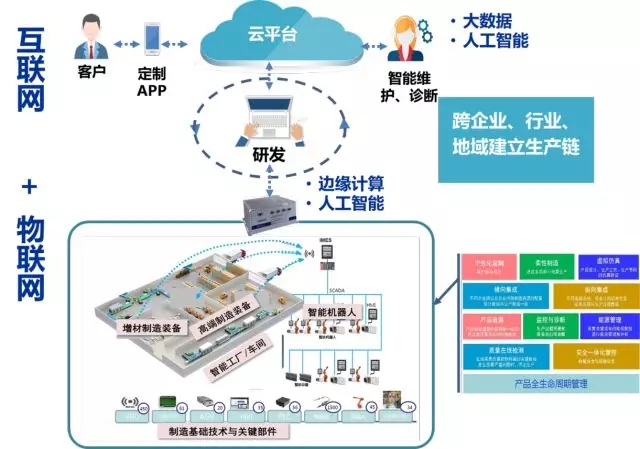 另一方面,借助互聯網、云、大數據能等新一代信息技術實現跨企業、跨行業、跨地區的網絡協同制造,以及利用人工智能技術實現智能產品的版本升級、遠程診斷和預測性維護等智能服務,更進一步將分析結果反饋到規劃設計、產品開發、生產優化,實現產品全生命周期的閉環控制。