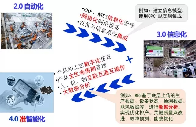圖1中工業2.0到3.0的最重要內容是采用ERP和MES(兩者融合趨勢明顯)等生產管理系統(或稱IT信息系統)進行運營和生產管理,并實現與自動化系統(或稱OT運行系統)的縱向集成,推薦采用OPC UA解決方案,建立設備信息模型并提供統一接口。圖中工業4.0階段尚未實現制造系統的自適應、自組織、自決策并跨企業、跨行業、跨地域調動生產資源等智能制造愿景,因此將其稱為準智能化。3.0到4.0的最重要內容是實現產品全生命周期管理,實現信息流與價值流(含物流、資金流)的協調整合。