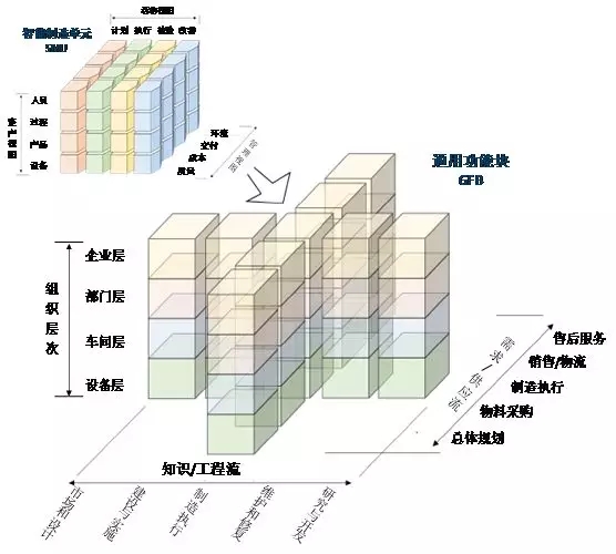 此外,從制造業整體出發,企業實施智能制造具有通用的功能和活動。因此,IVRA還定義了通用功能塊(GFB),通過知識/工程流、需求/供應流和企業組織層級三個軸向進行描述,如圖8所示。從工程角度出發,知識/工程流包含的設計信息和工程信息,可劃分為市場和設計、構造和實現、制造執行、維護和修復、研究和開發五個通用功能。需求/供應流是指由多家企業組成的價值鏈,涉及將原料轉變為最終產品并運送至終端用戶的所有活動,包括總體規劃、原料采購、制造執行、銷售與物流、售后服務。知識/工程流與需求/供應流在制造執行階段交匯因而具有共同的GFB。更進一步,智能制造通用功能分解到企業的各個垂直層級也形成不同的功能塊,自底向上包括設備層、車間層、部門層和企業層。