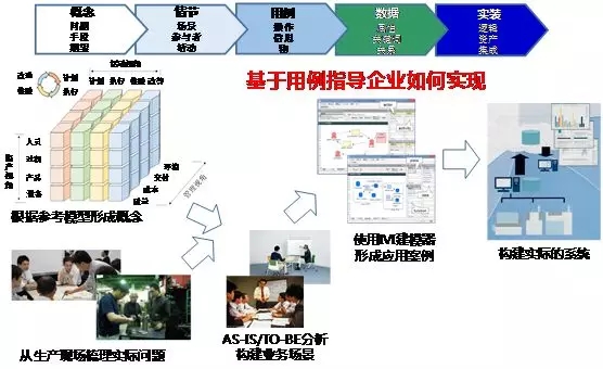IVI提出IVRA的一個主要目的在于分析制造過程中哪里存在問題,并理清提供解決方案的系統范圍[9]。因此,IVI在定義IVRA模型的同時,配套實施了一系列步驟,來推動IVRA在智能制造中得以真正應用,如圖9所示。首先基于概念化的IVRA統一參考架構模型,定義用戶(工廠)生產現場中存在的實際問題,經過AS-IS/TO-BE分析,使用“IVI用例器”工具來形式化描述業務場景,最終指導在工廠中構建實際的制造系統。這種標準化描述的業務場景更容易取得解決方案供應商和制造用戶的一致理解。