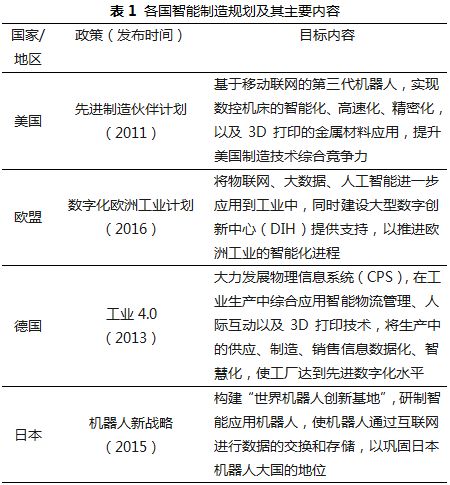 20世紀80年代,工業發達國家已開始對智能制造進行研究,并逐步提出智能制造系統和相關智能技術。進入21世紀,網絡信息技術迅速發展,實現智能制造的條件逐漸成熟。在國際金融危機之后,虛擬經濟出現泡沫,傳統制造業強國開始將重心轉回實體制造,頒布了一系列發展智能制造的國家戰略(表1),期望以發展制造業刺激國內經濟增長,鞏固大國地位。