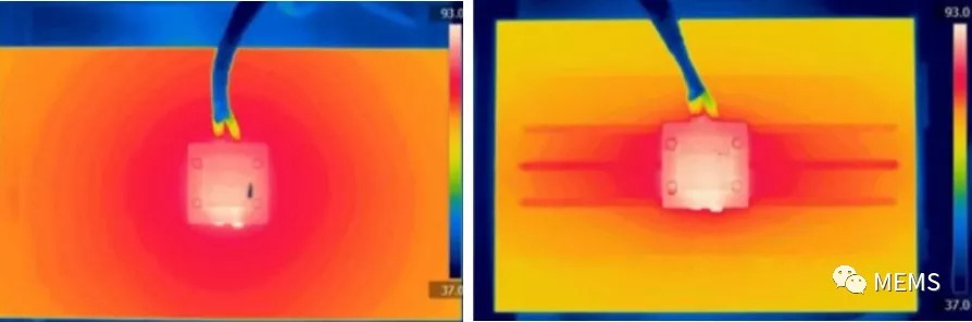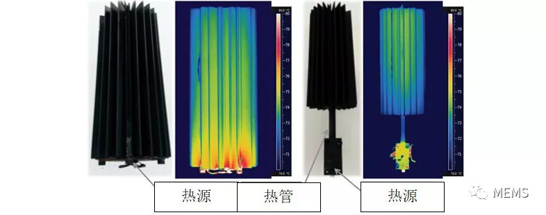 ►左圖:熱源和傳統散熱片直接接觸,散熱片溫度呈現明顯的熱梯度分布;