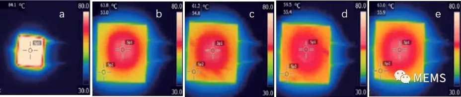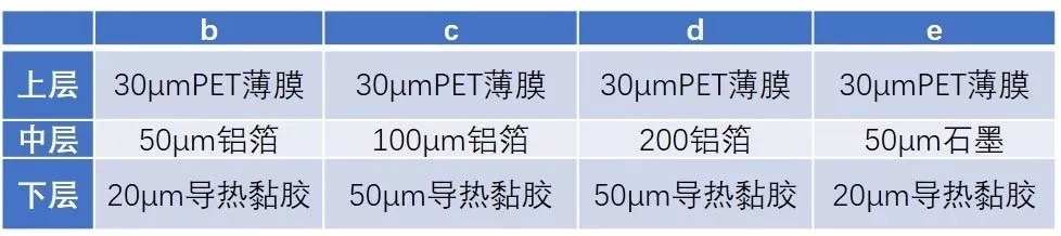 下圖為不同規格的散熱薄膜材料的篩選對比,其中a為對照組,熱源不做任何散熱措施,b~d熱像圖所用散熱材料從上到下的微觀分層為: