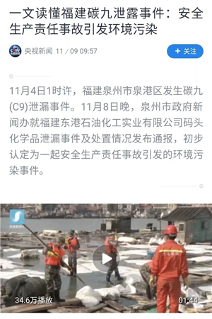 2018年11月3日16時(shí)左右,“天桐1”油輪靠泊泉州市泉港區(qū)東港石化公司碼頭;11月3日19時(shí)20分,開始從東港石化碼頭輸油管道進(jìn)行工業(yè)用裂解碳九的裝船作業(yè);11月4日凌晨0時(shí)51分,輸油管出現(xiàn)跳管現(xiàn)象;凌晨1時(shí)13分,東港石化碼頭作業(yè)人員發(fā)現(xiàn)裝船過(guò)程中發(fā)生工業(yè)用裂解碳九化學(xué)品泄漏。現(xiàn)場(chǎng)工作人員立即采取停泵關(guān)閥措施,并委托有資質(zhì)的單位迅速到碼頭進(jìn)行污油回收。凌晨1時(shí)23分油品停止泄漏;凌晨2時(shí)許,處置單位趕到碼頭進(jìn)行污油回收;凌晨4時(shí)30分,圍油欄內(nèi)清污作業(yè)基本結(jié)束。但部分污油向鄰近的肖厝海域移動(dòng),泉港部分區(qū)域空氣出現(xiàn)刺鼻性氣味。初步認(rèn)定為一起安全生產(chǎn)責(zé)任事故引發(fā)的環(huán)境污染事件。