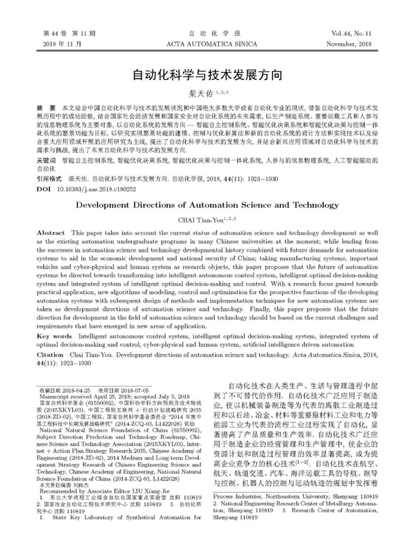 摘要:本文結合中國自動化科學與技術的發展狀況和中國絕大多數大學設有自動化專業的現狀, 借鑒自動化科學與技術發展歷程中的成功經驗, 結合國家社會經濟發展和國家安全對自動化系統的未來需求, 以生產制造系統、重要運載工具和人參與的信息物理系統為主要對象, 以自動化系統的發展方向— 智能自主控制系統、智能優化決策系統和智能優化決策與控制一體化系統的愿景功能為目標, 以研究實現愿景功能的建模、控制與優化新算法和新的自動化系統的設計方法和實現技術以及結合重大應用領域開展的應用研究為主線, 提出了自動化科學與技術的發展方向, 并結合新興應用領域對自動化科學與技術的需求與挑戰, 提出了未來自動化科學與技術的發展方向.