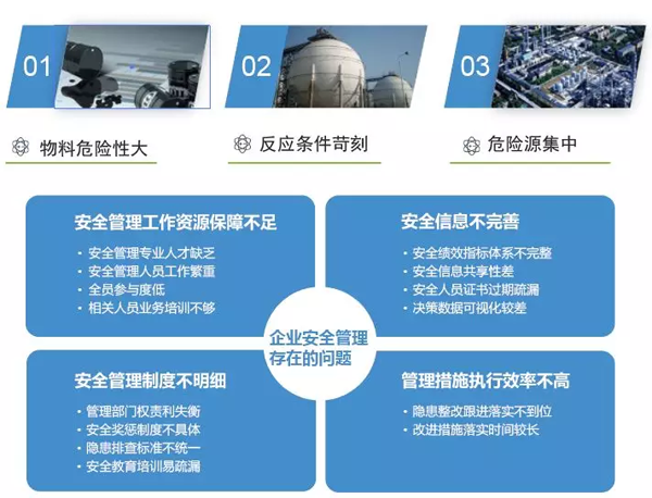 隨著社會(huì)對(duì)企業(yè)安全生產(chǎn)和環(huán)境保護(hù)的重視程度日益提高,安全、環(huán)保已成為化工企業(yè)的核心競(jìng)爭(zhēng)力。對(duì)此,從國(guó)家層面到地方政府制定了一系列安全、環(huán)保管理的法律法規(guī),企業(yè)也相應(yīng)制定了一系列管理制度,以確保安全、環(huán)保管理的合法合規(guī)。然而,仍然存在大量違章指揮、違章操作、違反勞動(dòng)紀(jì)律的現(xiàn)象發(fā)生,從而導(dǎo)致嚴(yán)重事故的發(fā)生。在安全、環(huán)保管理過程中亟需一個(gè)標(biāo)準(zhǔn)化的解決方案推動(dòng)制度的執(zhí)行及效果跟蹤,確保安全、環(huán)保管理措施的落地,為企業(yè)“零事故、零傷亡”目標(biāo)的實(shí)現(xiàn)保駕護(hù)航。