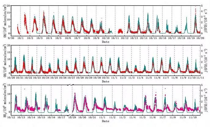 圖3和圖4分別為氣體擴(kuò)張激光誘導(dǎo)熒光技術(shù)系統(tǒng)和外場觀測的HOx自由基濃度數(shù)據(jù)。由于白天OH自由基的主要來源是臭氧光解,故而可同步測量臭氧的光解速率j(O1D)。未來將進(jìn)一步發(fā)展基于氣體擴(kuò)張激光誘導(dǎo)熒光技術(shù)的地基、機(jī)載、船載等多平臺HOx/OH/ROx自由基探測系統(tǒng),研究對象也逐漸過渡到自由基、反應(yīng)中間體、反應(yīng)參數(shù)和污染生成潛勢的直接測量,逐步打破現(xiàn)有各種研究手段的界限,通過外場觀測、煙霧箱模擬實驗以及數(shù)值模擬,形成基于量化計算和數(shù)值模擬引導(dǎo)的外場反應(yīng)動力學(xué)閉合研究。