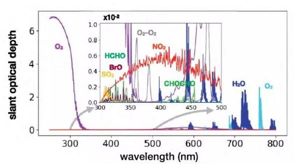 在120公里以下的高空中,除地球大氣的主要組成—氮分子、氧分子和惰性氣體,大氣中還存在著微量痕量氣體。這些痕量氣體雖體積濃度小(不到萬一之一),但能對全球大氣環(huán)境及生態(tài)產(chǎn)生重大的影響,例如溫室效應(yīng)、光化學(xué)煙霧、臭氧層破壞等。光學(xué)/光譜學(xué)方法利用光學(xué)中的吸收、發(fā)射、散射以及大氣輻射傳輸?shù)确椒ǎㄟ^建立特征因子指紋光譜數(shù)據(jù)庫和定量解析算法,獲取痕量氣體的特性,可用于空氣質(zhì)量、固定和流動污染源自動監(jiān)測。圖1為部分痕量氣體在紫外—可見波段的吸收光譜。對于常規(guī)氣體,目前的空氣質(zhì)量監(jiān)測系統(tǒng)除采用單點測量外,主要利用各種光學(xué)技術(shù)路線:如針對SO2、NO2、O3及THC、CH4、NMHC、BTX等污染物,差分光學(xué)吸收光譜技術(shù)(Differential Optical Absorption Spectroscopy,DOAS)利用氣體分子的吸收特性來鑒別成分,并根據(jù)窄帶吸收強(qiáng)度反演出微量氣體的濃度,采樣代表性較傳統(tǒng)的點式有較大的改善,有利于對空氣質(zhì)量的表征;針對溫室氣體CO2,光腔衰蕩光譜技術(shù)(Cavity Ring-Down Spectroscopy,CRDS)利用相對較窄的吸收窗口,可以避免其他組分干擾,實現(xiàn)較高精度檢測;針對光化學(xué)反應(yīng)中起關(guān)鍵作用的CO,利用可調(diào)諧半導(dǎo)體激光吸收光譜技術(shù)(Tunable Diode Laser AbsorptionSpectroscopy,TDLAS)的波長調(diào)諧特性,用單一窄帶的激光頻率掃描通過氣體分子的一條或者幾條氣體特征吸收線,獲得被測氣體的特征吸收光譜范圍內(nèi)的吸收光譜,實現(xiàn)CO的定性或定量分析;或者利用光聲光譜技術(shù),根據(jù)氣體吸收—強(qiáng)度隨時間變化的光束而被加熱時所引起的一系列聲效應(yīng),來獲得氣體的濃度。
