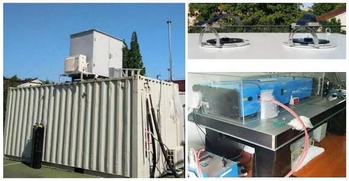 HOx(OH、HO2)自由基是大氣中最重要的氧化劑,對HOx自由基的準(zhǔn)確測量是研究對流層大氣氧化性的先決條件。OH可以與CO、NO2、SO2、CH4、VOCs等大多數(shù)痕量氣體成分反應(yīng),影響對流層化合物壽命,是一次污染物去除和二次污染物生成的重要途徑。HO2自由基是大氣化學(xué)過程中重要的中間產(chǎn)物,是一次污染物去除與二次污染物生成的重要媒介,眾多二次污染物的形成都與其密切相關(guān)。開展HOx自由基大氣探測研究有助于了解復(fù)雜大氣條件下自由基化學(xué)反應(yīng)過程,從機(jī)理層面認(rèn)識二次污染的成因。由于大氣中的HOx自由基濃度極低且時空變化劇烈,實現(xiàn)對它的準(zhǔn)確定量測量具有較大的挑戰(zhàn)性。目前HOx自由基的探測技術(shù)主要包括差分吸收光譜技術(shù)、基體分離和電子自旋共振技術(shù)(Matrix Isolationand Electron Spin Resonance,MIESR)、化學(xué)離子化質(zhì)譜法(Chemical Ionization Mass Spectrum,CIMS)和氣體擴(kuò)張激光誘導(dǎo)熒光技術(shù)(Fluorescence Assayby Gas Expansion,FAGE)。差分吸收光譜技術(shù)基于朗伯比爾吸收定律和308nm左右的強(qiáng)離散型線性吸收光譜來判斷OH自由基濃度,但靈敏度不高;基體分離電子自旋共振技術(shù)根據(jù)含有未成對電子的過氧自由基的順磁性對其濃度進(jìn)行測定,可以實現(xiàn)HO2自由基的直接測量,但對樣品采集時間和采集條件要求高,操作不便;化學(xué)離子化質(zhì)譜法測量HOx自由基選擇性好、檢測限低,但目前主要用于清潔地區(qū)過氧自由基的測量。相比之下,氣體擴(kuò)張激光誘導(dǎo)熒光技術(shù)利用308nm激光將OH自由基激發(fā)至電子激發(fā)態(tài),探測激發(fā)態(tài)OH自由基發(fā)出的熒光來確定大氣中OH自由基的濃度;如要測量HO2自由基,則需向轉(zhuǎn)換裝置中通入一定濃度的NO將HO2自由基轉(zhuǎn)化為OH自由基,再測OH自由基,該技術(shù)靈敏度較高,實物如圖3所示。