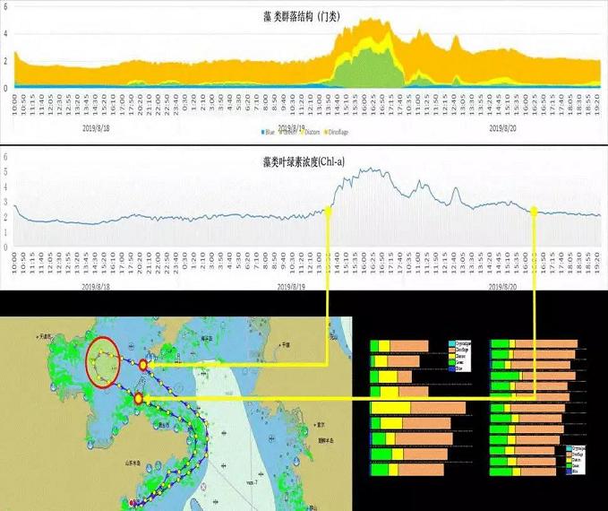 圖8為2019年中科院自行研制的海洋生物要素在線監(jiān)測儀在青島南姜碼頭試驗,成功獲取了藻類群落結(jié)構(gòu)、葉綠素濃度等數(shù)據(jù)以及典型海域生物要素分布特征。