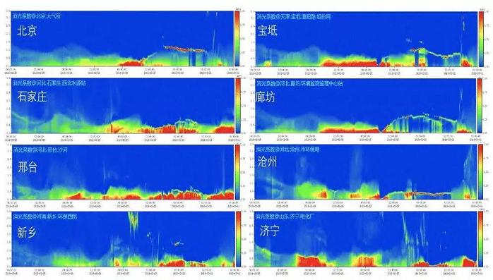 在2017年9月實施的“大氣重污染成因與治理攻關(guān)項目(總理基金)”中,中國科學(xué)院安徽光學(xué)精密機(jī)械研究所聯(lián)合國內(nèi)其他院所高校在京津冀地區(qū)建立了16個地基立體觀測站點,開展了基于激光雷達(dá)等儀器的顆粒物立體探測研究。圖6為2017年12月25-30日激光雷達(dá)觀測的一次污染過程。12月27日下午京津冀地區(qū)污染物主要分布在1km以下,28日高空1km污染團(tuán)與近地面污染混合,污染過程持續(xù),28日夜間-29日凌晨,混合層高度降低,局地污染加劇至30日,30日下午混合層抬升,風(fēng)速增大,擴(kuò)散條件轉(zhuǎn)好,污染消散。地基單點固定式激光雷達(dá)的長期觀測十分必要,對于研究和統(tǒng)計分析一些重要大氣成分的變化規(guī)律具有重要價值。但車載、船載和機(jī)載式的可移動式平臺,機(jī)動性強(qiáng),更適合應(yīng)急和特殊環(huán)境的觀測,如機(jī)載式和船載式可以在海洋上空觀測,其觀測資料更能代表區(qū)域性大氣成分的分布。總之,多平臺、多類型雷達(dá)的聯(lián)合運用,在一些區(qū)域性乃至全球性大氣輻射和環(huán)境研究的對比實驗中發(fā)揮了重要作用。