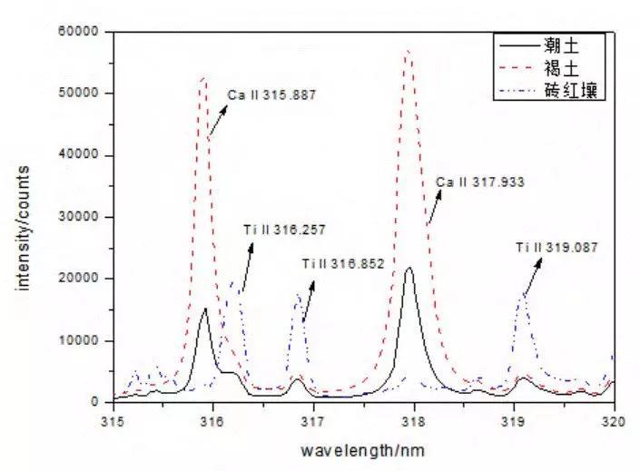 不同類型的土壤其組成的元素在含量上具有較大的差異,即使是同一類型的土壤,其組成元素也會存在微小的差異。圖10是褐土、潮土和磚紅壤三類土壤在315-320nm光譜范圍內(nèi)的特征譜線,其中褐土的Ca特征譜線最強(qiáng),而磚紅壤的Ti特征譜線強(qiáng)度最大。從這些土壤的LIBS光譜中可明顯體現(xiàn)出其元素含量的差異。