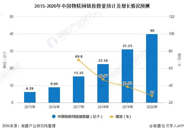 觀察物聯(lián)網(wǎng)產(chǎn)業(yè)的發(fā)展規(guī)模最直觀的數(shù)據(jù)就是“物聯(lián)網(wǎng)終端連接數(shù)”,從連接數(shù)看,據(jù)前瞻產(chǎn)業(yè)研究院統(tǒng)計數(shù)據(jù)顯示,2015年我國物聯(lián)網(wǎng)鏈接數(shù)量為6.39億個,截止至到2017年我國物聯(lián)網(wǎng)鏈接數(shù)量達到了15.35億個,相比2016年增長了69.8%。初步預(yù)計2018年我國物聯(lián)網(wǎng)鏈接數(shù)量突破20億個,在2019年我國物聯(lián)網(wǎng)鏈接數(shù)量將達31.25億個,同比增長38.52%。并預(yù)測在2020年我國物聯(lián)網(wǎng)鏈接數(shù)量將達到40億個,相比2017年增長約160%,而且這還是產(chǎn)業(yè)視角的保守估計,從物聯(lián)網(wǎng)的連接構(gòu)成看,目前應(yīng)用最多三個方向為智能硬件、智能家電和智能計量,細分行業(yè)中智能家居和智能安防的發(fā)展最快,這一切應(yīng)該與巨頭的推動有關(guān)。