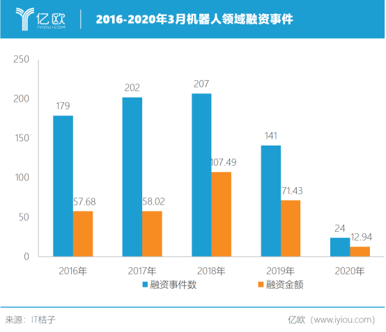 到了2020年,從一月到三月,機(jī)器人行業(yè)的融資事件共有8起。3月,擎朗機(jī)器人獲得2億人民幣,梅卡曼德獲得1億人民幣。