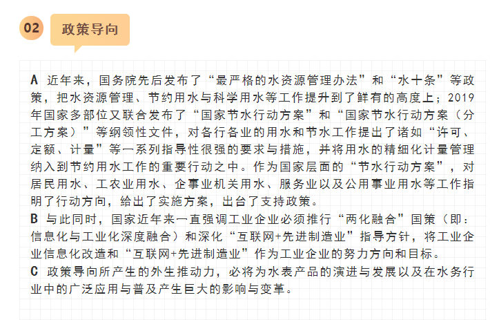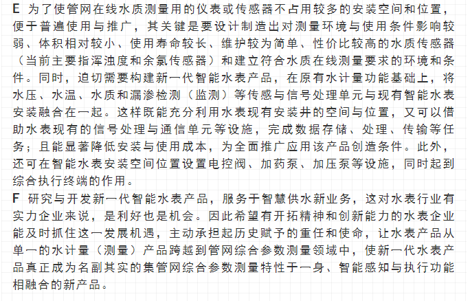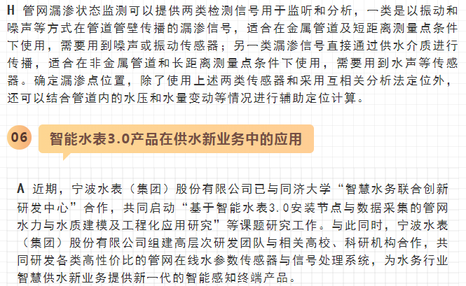 最近,寧水集團已正式啟動新一代智能水表(智能水表3.0)產(chǎn)品及供水新業(yè)務系統(tǒng)的商用化研發(fā)工作,在原先公司多個博士后課題研究基礎上進行商品化與工程化應用研究。可以預期,在不遠將來公司將為供水管網(wǎng)系統(tǒng)提供高性價比的水務綜合大數(shù)據(jù),為管網(wǎng)現(xiàn)代化管理提供信息來源與決策依據(jù)(這方面詳細內容可參見附錄:“水表產(chǎn)品演進之路——從智能水表1.0/2.0產(chǎn)品向智能水表3.0產(chǎn)品邁進”一文)。至2020年初,公司在與浙江大學控制科學與工程學院合作基礎上,又先后與同濟大學環(huán)境科學與工程學院、寧波大學信息科學與工程學院等高校共同簽訂戰(zhàn)略合作協(xié)議,并聯(lián)合成立了“水務新技術研發(fā)實驗室”和“水務信息感知研發(fā)實驗室”,并將與寧波工業(yè)互聯(lián)網(wǎng)研究院等科研機構就水務新型傳感技術、供水關鍵核心業(yè)務等的解決方案展開合作研究。
