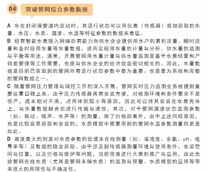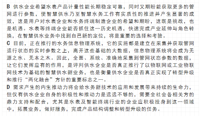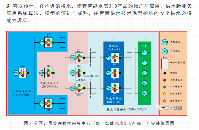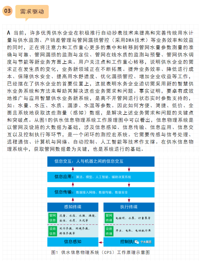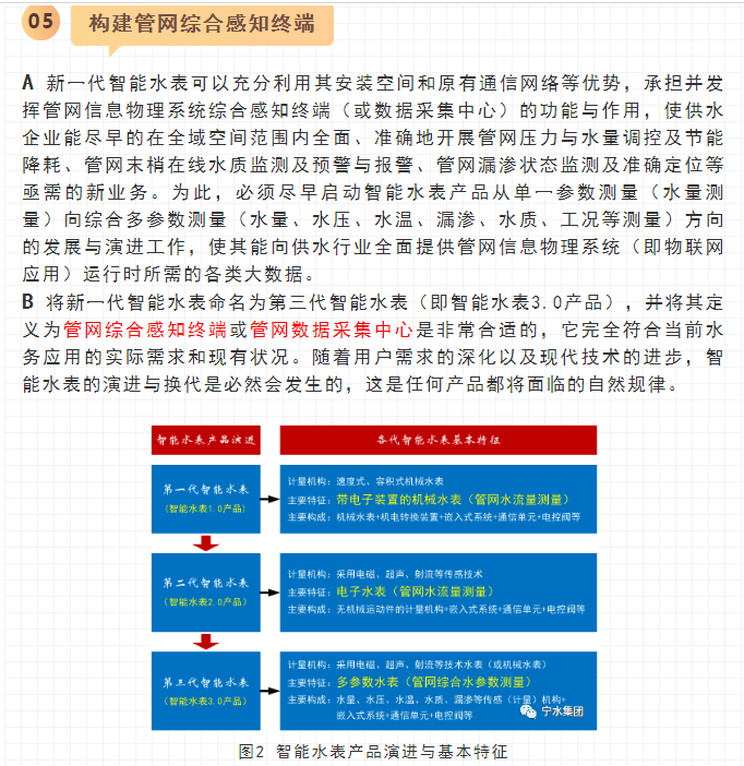 寧水集團2019年初在主板A股上市后,進一步確立了服務于智慧供水新業(yè)務的戰(zhàn)略方針與目標,在持續(xù)做好水表產(chǎn)品水計量性能提升、以NB-IoT及5G技術等為代表的無線數(shù)據(jù)遠傳業(yè)務拓展以及DMA分區(qū)計量漏損監(jiān)測、水務信息化應用等工作基礎上,正在努力向供水管網(wǎng)數(shù)據(jù)綜合提供商和智慧供水核心業(yè)務服務商轉型與升級,其近中期目標是向供水企業(yè)提供在線一體化的高性價比管網(wǎng)綜合大數(shù)據(jù)感知裝置(包括:水量、水壓、水質、漏滲、水溫等參數(shù)),為智慧供水新業(yè)務及水務信息化云平臺提供海量數(shù)據(jù)支撐,使現(xiàn)有水力、水質、漏損、能耗等水務管網(wǎng)模型運行準確度能夠顯著提升。