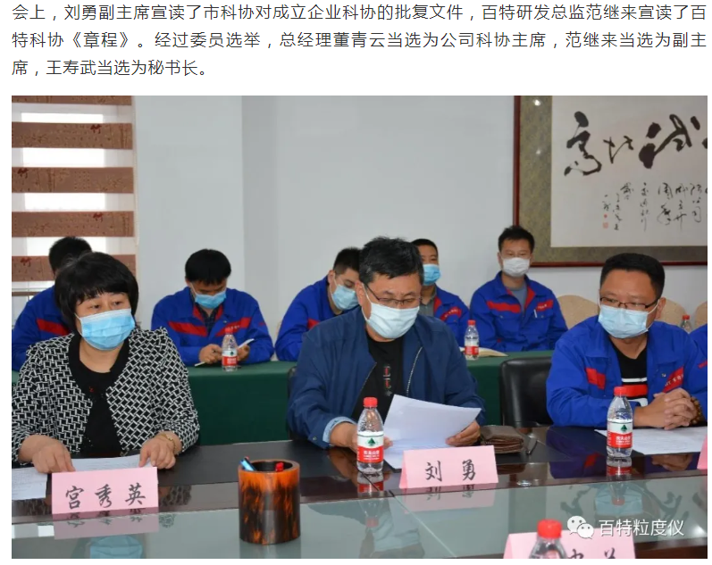 丹東百特儀器有限公司是中國(guó)儀器儀表行業(yè)協(xié)會(huì)會(huì)員單位,主要產(chǎn)品:智能激光粒度儀,顯微圖像粒度粒形分析儀,粉體綜合特性測(cè)試儀,沉降粒度儀,光阻法顆粒計(jì)數(shù)器,PM2.5監(jiān)測(cè)儀,光阻法粒徑譜儀。為提升公司的創(chuàng)新能力,6月2日,丹東百特儀器有限公司隆重召開(kāi)丹東百特科學(xué)技術(shù)協(xié)會(huì)成立暨第一次會(huì)員會(huì)議,丹東市科協(xié)主席宮秀英、副主席劉勇等領(lǐng)導(dǎo)到會(huì)祝賀,百特公司董事長(zhǎng)、總經(jīng)理董青云,副總經(jīng)理劉忠蘭等會(huì)員參加會(huì)議。