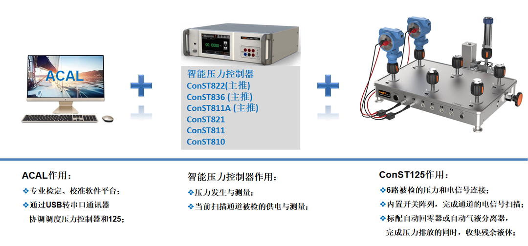 通過該設(shè)備,可配合ConST800系列壓力控制器、ACal檢定/校準(zhǔn)系統(tǒng)軟件,構(gòu)成一套多通道全自動(dòng)壓力檢定/校準(zhǔn)系統(tǒng),檢校過程多通道自動(dòng)切換,自動(dòng)采集數(shù)據(jù),完成后自動(dòng)出具證書,滿足用戶的大批量測(cè)試需求。