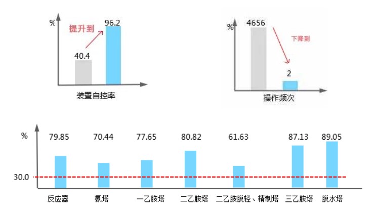基于以上分析,中控技術結合乙胺裝置工藝特點和過程控制需求,采用多變量模型預測控制,結合專家控制等智能控制策略,實現(xiàn)乙胺裝置多目標優(yōu)化和協(xié)同控制,提高裝置生產(chǎn)運行的平穩(wěn)性,降低操作人員勞動強度,為生產(chǎn)過程提供安全保障并通過“卡邊”優(yōu)化,降低能耗。