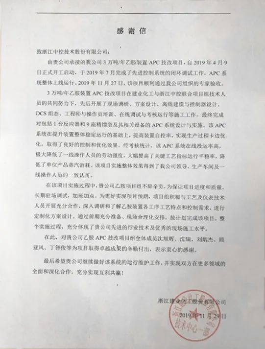 與此同時,乙胺裝置先進控制系統(tǒng)的價值得到了建業(yè)化工的一致認可。2020年4月,建業(yè)化工再次選擇與中控技術合作,簽訂了異丙胺、乙胺三期、丁胺、正丙胺、醋酸酯等5套裝置先進控制系統(tǒng);雙方互信共贏,共同促進建業(yè)化工逐步走向更高效、更精細、更智能的生產(chǎn)模式,為國內(nèi)有機胺行業(yè)探索一條安全生產(chǎn)、綠色環(huán)保、節(jié)能降耗、質(zhì)量提升、降本增效的新路徑。