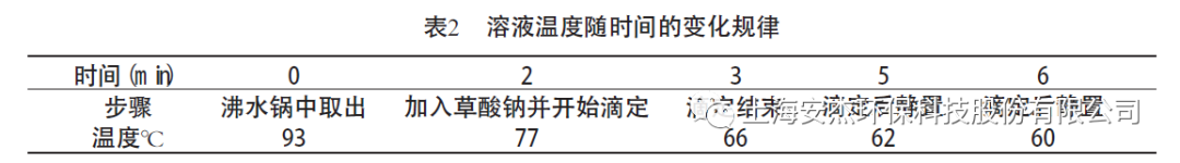 從沸水浴中取出錐形瓶時的溫度可達93℃,但加入草酸鈉溫度下降了16℃;滴定過程只用了1min, 溫度卻又下降了11℃,達到66℃。與反應溫度下限只差6℃;滴定結束后在放置3min,溫度降至60℃。由此可見,滴定過程必須自加熱結束起快速進行,爭取在3min 內結束滴定,不能超過6 min。