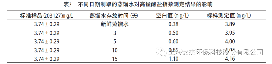 標樣測定值隨著空白值的增大而增大,當空白值為0.60 mg/ L (即蒸餾水存放時間為5 天)時,測定結果已接近不確定度的上限,而空白值超過0.85 mg/ L (即蒸餾水存放時間超過10 天)時,測定結果已超出不確定度的上限。因此,在測定高錳酸鹽指數時,不要使用存放時間超過5 天的蒸餾水,最好取用新鮮蒸餾水,這樣就可以減少空白值對測定結果的影響。