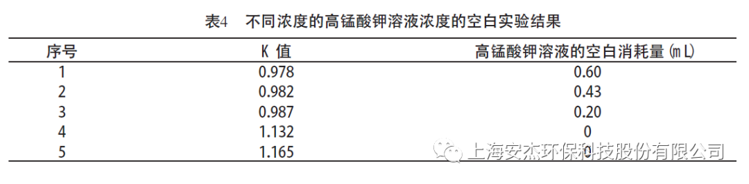 當K值較小即高錳酸鉀溶液濃度過低時,空白消耗量偏大,使測定結果偏低;當K 值較大即高錳酸鉀溶液濃度大于0.0100 mol/L時,空白消耗量為0 mL,空白實驗無法完成。所以在測定樣品前首先要將高錳酸鉀溶液濃度調至≤0.0100 mol/L,越接近理論值越好。