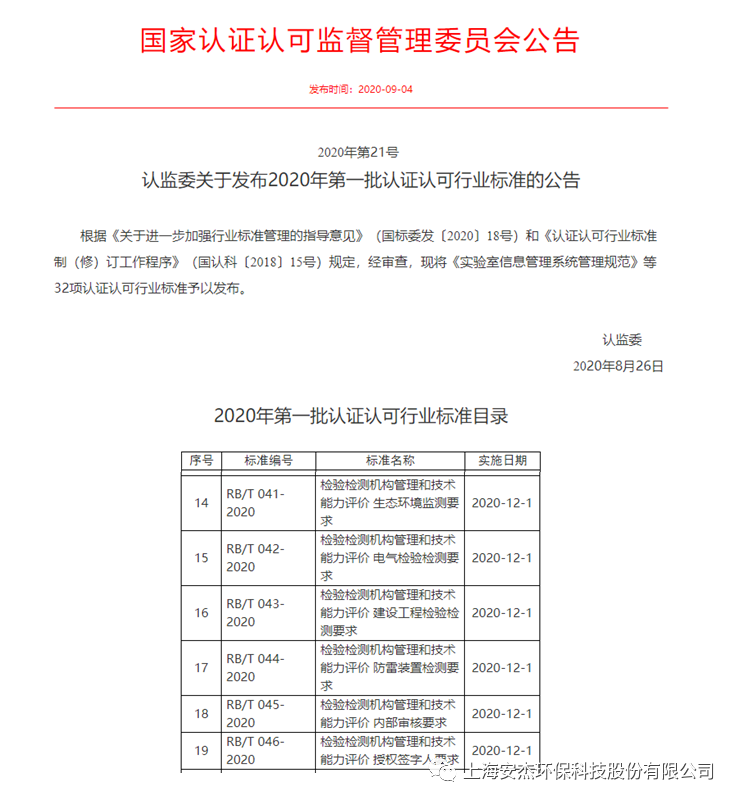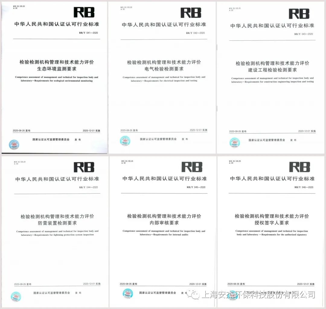 2020年9月4日,國家認(rèn)證認(rèn)可監(jiān)督管理委員會發(fā)布《2020年第21號 認(rèn)監(jiān)委關(guān)于發(fā)布2020年第一批認(rèn)證認(rèn)可行業(yè)標(biāo)準(zhǔn)的公告》,《RB/T 041-2020 檢驗檢測機構(gòu)管理和技術(shù)能力評價 生態(tài)環(huán)境監(jiān)測要求》、《RB/T 042-2020 檢驗檢測機構(gòu)管理和技術(shù)能力評價 電氣檢驗檢測要求》、《RB/T 043-2020 檢驗檢測機構(gòu)管理和技術(shù)能力評價 建設(shè)工程檢驗檢測要求》、《RB/T 044-2020 檢驗檢測機構(gòu)管理和技術(shù)能力評價 防雷裝置檢測要求》、《RB/T 045-2020 檢驗檢測機構(gòu)管理和技術(shù)能力評價 內(nèi)部審核要求》、《RB/T 046-2020 檢驗檢測機構(gòu)管理和技術(shù)能力評價 授權(quán)簽字人要求》獲得批準(zhǔn)發(fā)布。