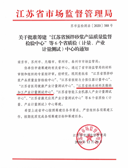 12月29日,江蘇省市場(chǎng)監(jiān)督管理局發(fā)文(蘇市監(jiān)檢測(cè)函[2020]388號(hào)),同意在蘇州市計(jì)量測(cè)試院的基礎(chǔ)上籌建江蘇省納米材料及微納加工產(chǎn)業(yè)計(jì)量測(cè)試中心。