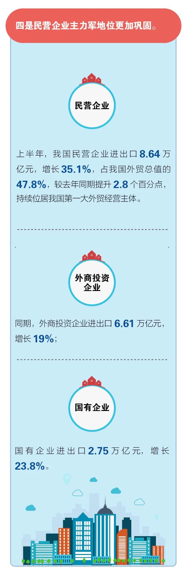 二是有進(jìn)出口實(shí)績(jī)的民營(yíng)企業(yè)增多。上半年,有進(jìn)出口實(shí)績(jī)的民營(yíng)企業(yè)39.7萬(wàn)家,同比增加了3.7萬(wàn)家,占有進(jìn)出口實(shí)績(jī)企業(yè)總數(shù)的82.8%。