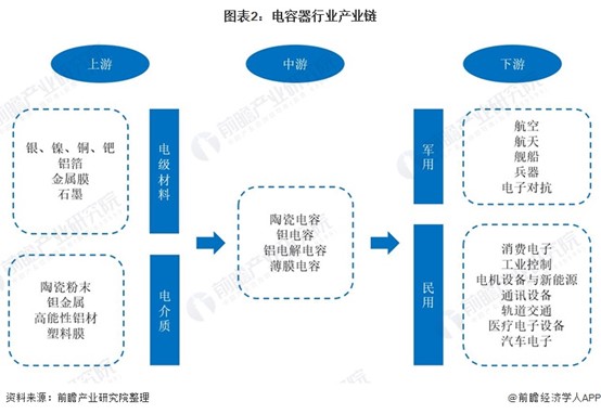 電容器產業鏈上游為電極材料和電解質材料行業,下游行業主要應用于軍用和民用領域,軍用領域包括航空、航天、艦船、兵器、電子對抗等,民用領域包括消費電子、工業控制、電力設備及新能源、通訊設備、軌道交通、醫療電子設備及汽車電子等。
