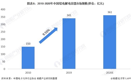 根據中國電子元件行業協會,2010年我國鋁電解電容器市場規模市場規模約為150億元,到2019年鋁電解電容器市場規模已經達到341億元,較2018增長5.24%,前瞻估計2020年中國鋁電解電容器市場規模約為361億元。