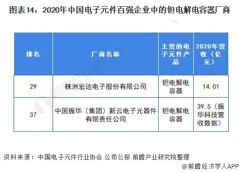 2020年中國電子元件百強企業中,2家鉭電解電容器廠商入選,其中,株洲宏達電子股份有限公司排名最前(29)。宏達電子產品涉及鉭電容器、多層瓷介電容器、單層瓷介電容器、薄膜電容器、高分子片式鋁電容器、超級電容器等。中國振華(集團)新云電子元器件有限責任公司為振華科技子公司,目前擁有全密封固體鉭電容器、液體鉭電容器、片式鉭電容器、有引線模壓固體但電容器、樹脂包封固體但電容器、鋁電容器六大類產品生產線、可生產鉭、鋁電容器科類達90多個系列品種、10000多個規格。