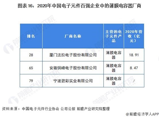 2020年中國電子元件百強企業中,3家薄膜電容器廠商入選,其中,廈門法拉電子股份有限公司排名最前(28)
